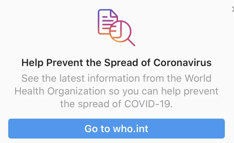 Instagram visar i tid och otid hur man som människa kan bidra till att vi tar oss ur krisen. Detta är mycket föredömligt eftersom yngre såväl som äldre målgrupper har ett högt användande av Instagram och Facebook, om inte ännu högre användande nu i tider då fler till exempel jobbar hemifrån (TechCrunch, 13 mars).